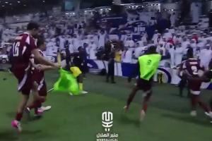 这一举动点燃了阿联酋球迷的怒火,他们纷纷向场内投资水瓶、鞋子等杂物,更有控制不住的阿联酋球迷直接冲场与安保扭打在一起。